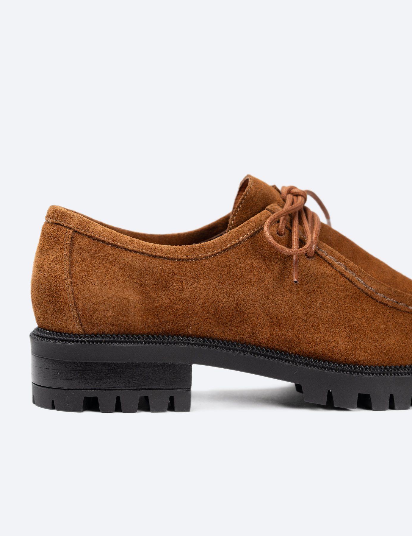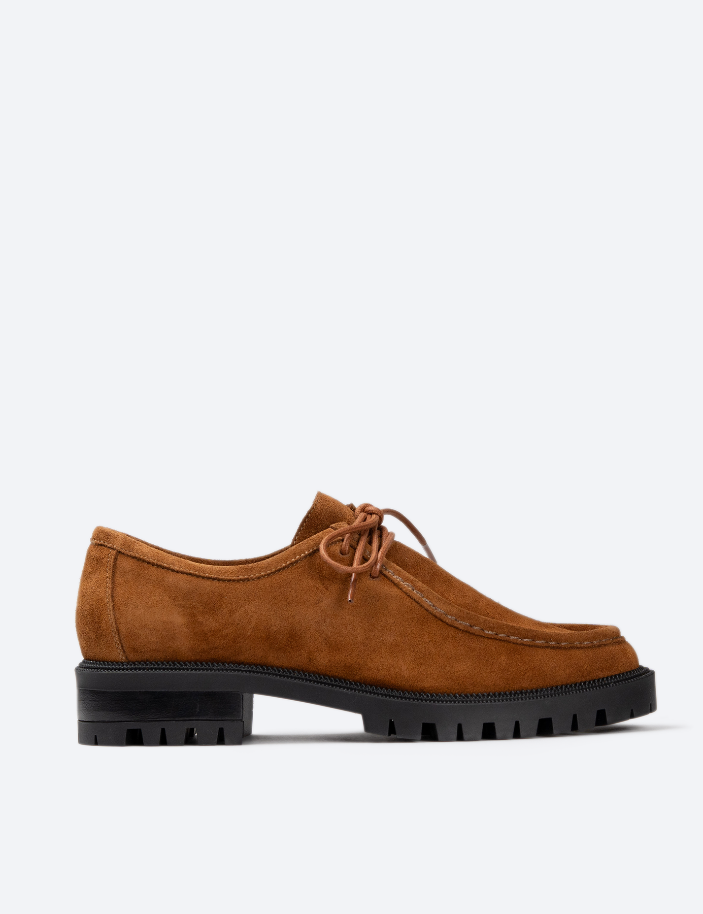 El proceso comienza con un minucioso estudio del cuero que se va a utilizar; tras encontrar la mejor pieza, el artesano la corta y le da forma alrededor de la horma para formar la parte superior. Esta se martilla delicadamente para suavizar las costuras y las partes en contacto con el pie. Ahora, la parte superior está lista para pegarse a la plantilla y luego unirse a la entresuela; el artesano guía el zapato bajo una línea laser con precisión y maestría. La suela de Eva Termoplástica posee bordes alisados, pulidos y cepillados. Su fabricación es un proceso tradicional que requiere técnica y destreza.