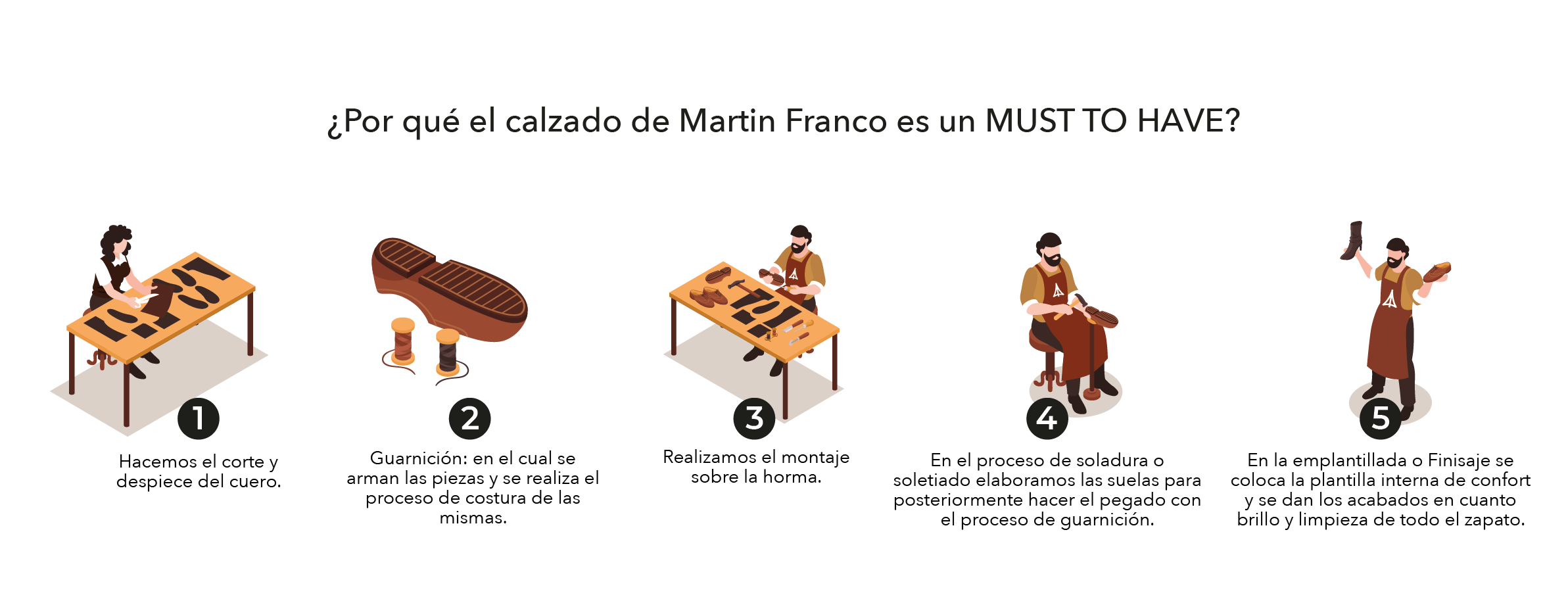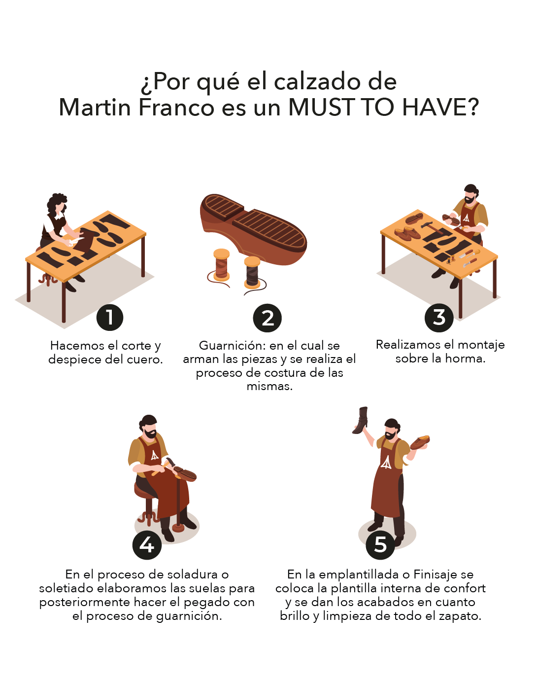 Ninguna de las anteriores aplicará en caso de evidenciarse un mal uso por parte del cliente. La garantía que da Martin & Franco S.A.S. cubre defecto en cosidos o despegue de suelas y herrajes, la garantía da comienzo con la fecha de la factura, la garantía representa una reparación del calzado o producto mas no el cambio por un nuevo par de zapatos o un nuevo producto, la garantía se da como aceptada por parte del cliente al recibir la factura electrónica de venta o con la guía de envío.